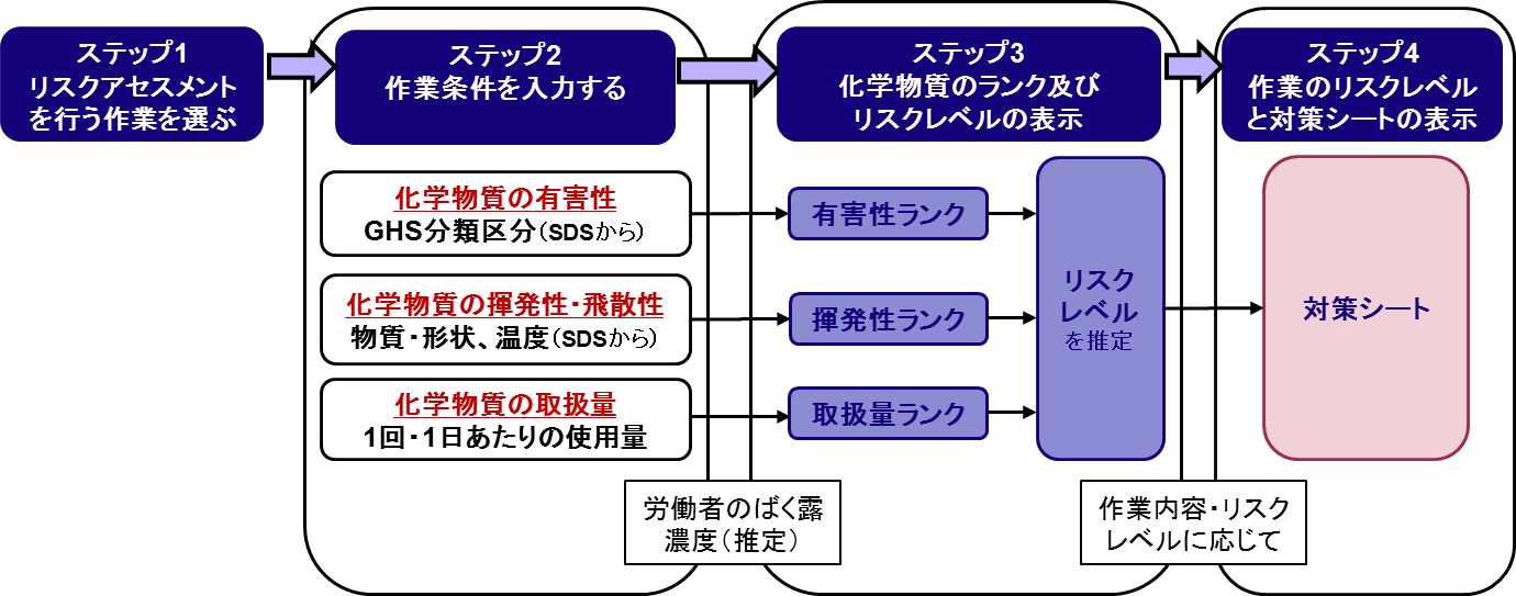 ・化学物質を取り扱う作業ごとに、「化学物質の有害性」、「物理的形態(揮発性/飛散性)」、「取扱量」の3つの要素の情報から、リスクの程度を4段階にランク分けし、ランクに応じた一般的な管理対策を示すほか、一般的に行われる作業については、より具体的な実施事項を示す(管理手段シート)ことができるツールである。