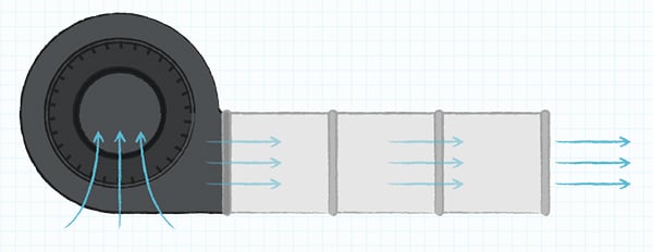 ・遠心式ファンは、ラジアルファンや遠心ブロワとも呼ばれ、モータ駆動のハブ内にインペラを搭載することで、ハウジング内に空気を取り込み、吸気口に対して90度(直角)の排気口から空気を排出します。