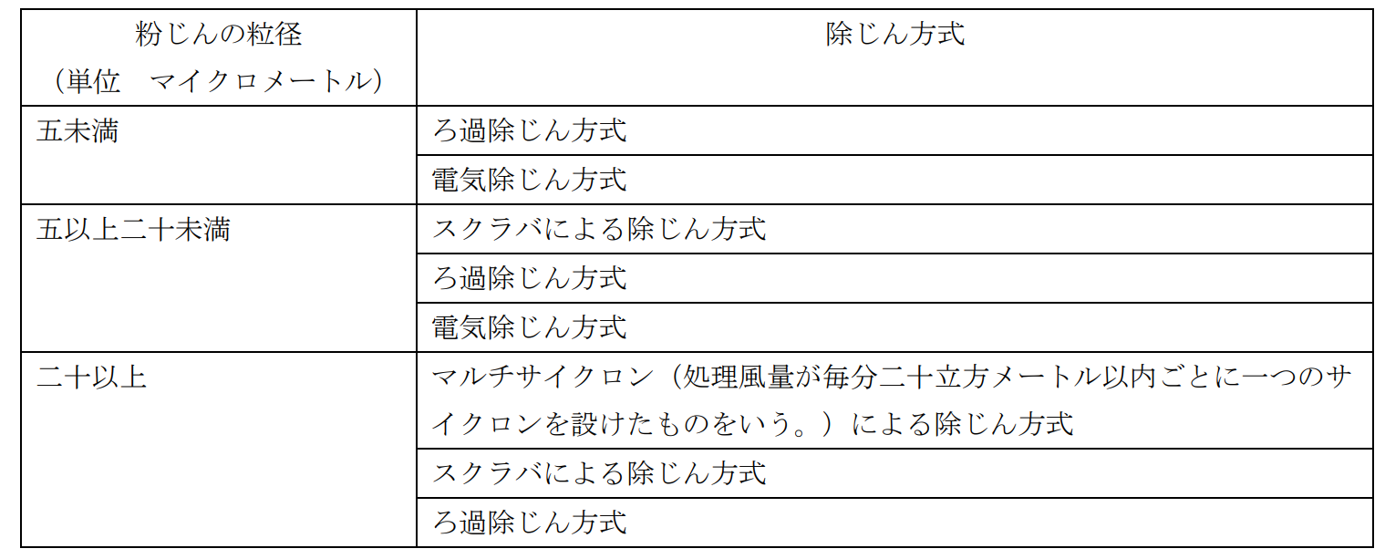 マルチサイクロンによる除じん方式、スクラバによる除じん方式、ろ過除じん方式、電気除じん方式