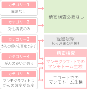 ※ 乳がんが疑われるのはカテゴリー3以上です。カテゴリー3以上の判定を受けた方は、「精密検査」を行う必要があります。