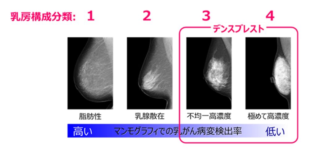・不均一高濃度と極めて高濃度を合わせて「高濃度乳房(デンスブレスト)」と呼びます。高濃度乳房は乳腺組織が多いため、がんなどの病変が白く映る乳腺の影に隠れやすく、検出が難しいことがあります。そのため、高濃度乳房では追加検査(超音波検査など)が勧められます.