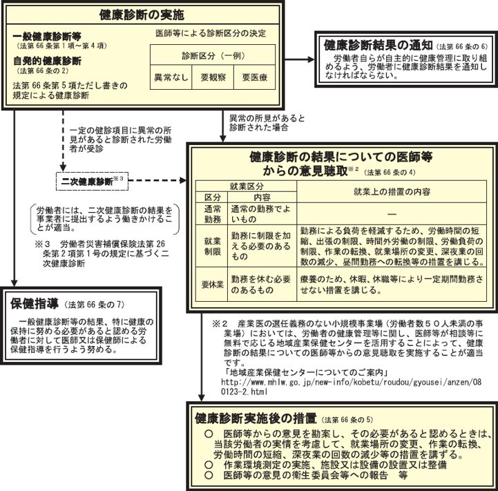 - 一般定期健康診断の実施と事後措置の流れ