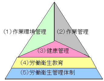 ・「労働衛生の3管理」に「総括管理(労働衛生管理体制)」と「労働衛生教育」を加えた労働衛生管理の基本となる概念をいう。