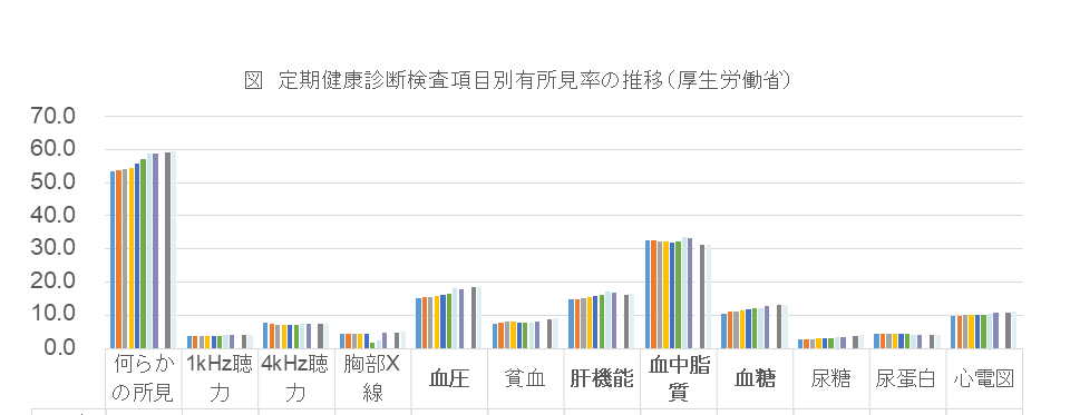 ・有所見者率増加の原因として、労働者の高齢化、検査項目の追加、項目の基準値の厳格化などが原因として考えられる。