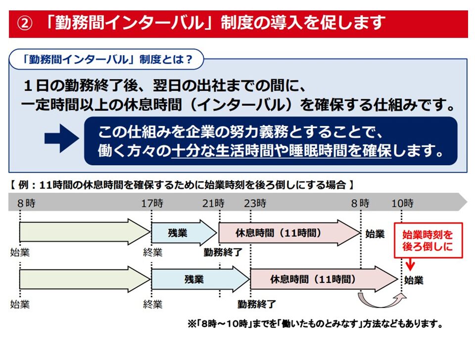 ・「一定時間以上のインターバル」とあるように、インターバルの最低時間などは設けられていないので、具体的に何時間をインターバルとして設定するかは労使間での交渉次第となります。
