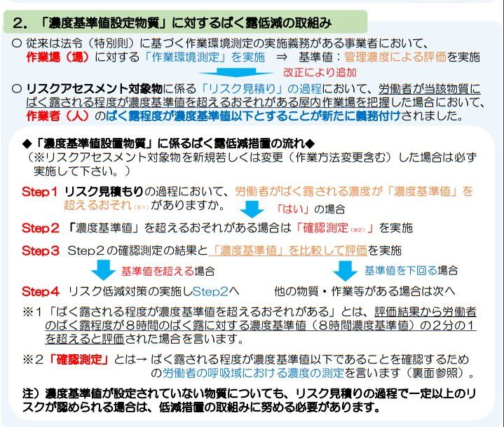 ・改正により、リスクアセスメント対象物に係る「リスク見積り」の過程において、労働者が当該物質にばく露される程度が濃度基準値を超えるおそれがある屋内作業場を把握した場合において、 作業者のばく露程度が濃度基準値以下とすることが新たに義務付けされた。