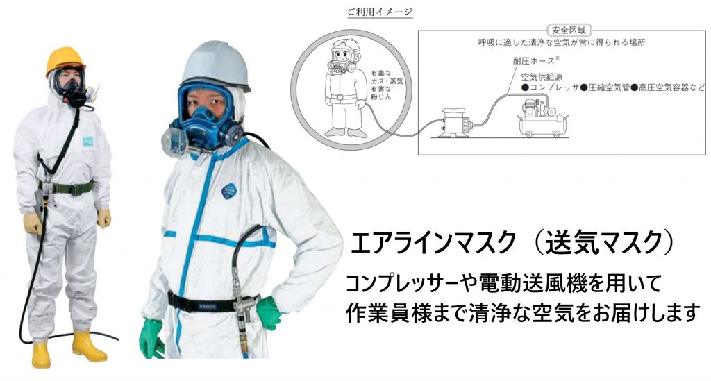 ・送気マスクは、自然の大気を空気源とする「ホースマスク」と、圧縮空気を空気源とする「エアラインマスク」および「複合式エアラインマスク」がある。