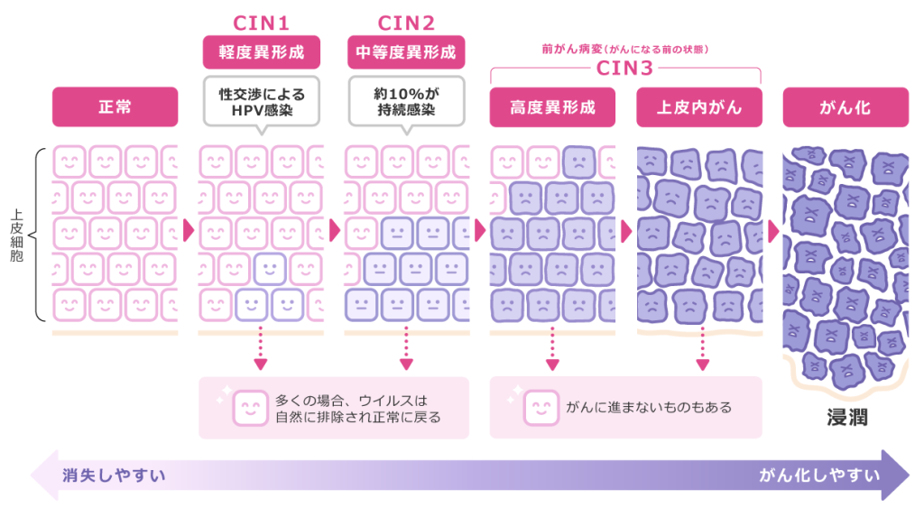 ・病変の程度により、軽度異形成(CIN1)、中等度異形成(CIN2)、高度異形成~上皮内がん(CIN3)に分類されます。