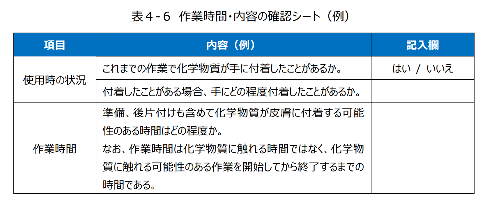 ・化学物質が、誰に、どのような状況で付着する可能性があるかを確認する。以下の確認シート(例)を参考に確認する。