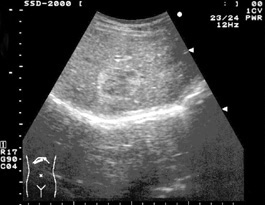 肝血管腫で辺縁にほぼ全周性に縁取られるように見られる高エコー(高輝度)所見のことを指します。