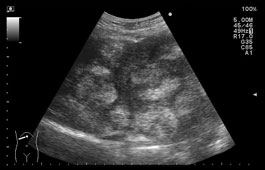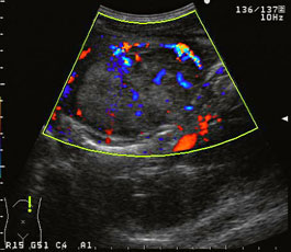 限局性結節性過形成(FNH: focal nodular hyperplasia)でよく見られる特徴的な血管パターン。造影超音波検査で血管相が早期に濃染される際に認められ肝腫瘍の中心から放射状に血管が伸びる様子を示し、「車輻様構造」とも表現されます。