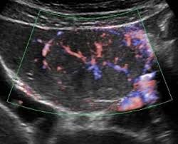 肝細胞癌などの多血性肝腫瘍で特徴的に認められる血流パターンの一つ。超音波のカラードプラ検査で、腫瘍の辺縁部から内部に向かって拍動性の血流信号が網目状に見えるもので、このパターンは腫瘍周囲の線維性被膜に存在する血管(動脈や門脈)が腫瘍を包み込むように走行しているために出現します。進行肝細胞癌の膨張性発育で周囲肝組織が圧迫され、線維化と血管増生が進行した状態を反映したものです
