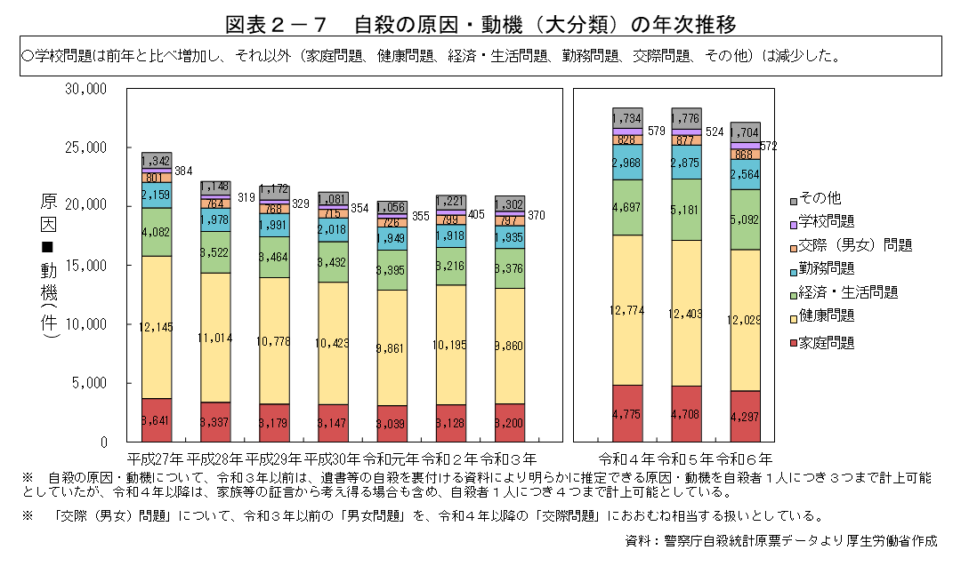 ・令和6年の自殺者数は20,320人で、前年と比べ1,517人減少し、統計開始以降2番目に少ない数値となった。