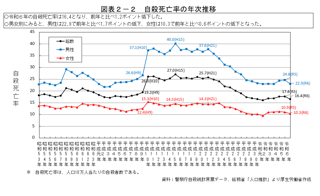 ・我が国の自殺者数は、平成10年(1998年)に3万人を超え、平成15年には統計を取り始めた昭