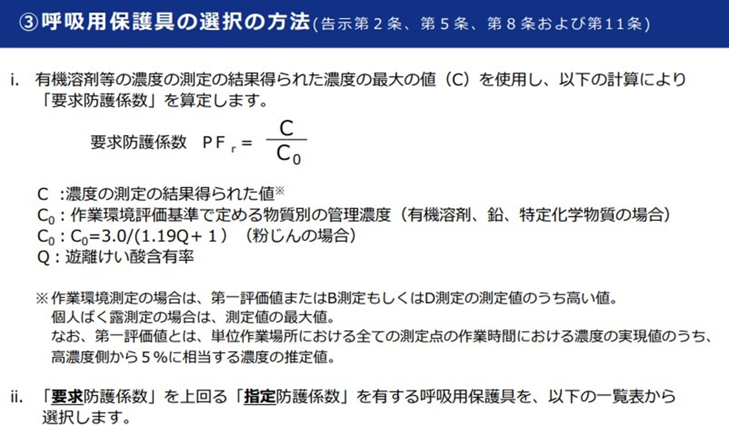 ・呼吸用保護具の選択に際しては、「要求防護係数」を上回る「指定防護係数」を有する呼吸用保護具を、「指定防護係数一覧」 から選択します。
