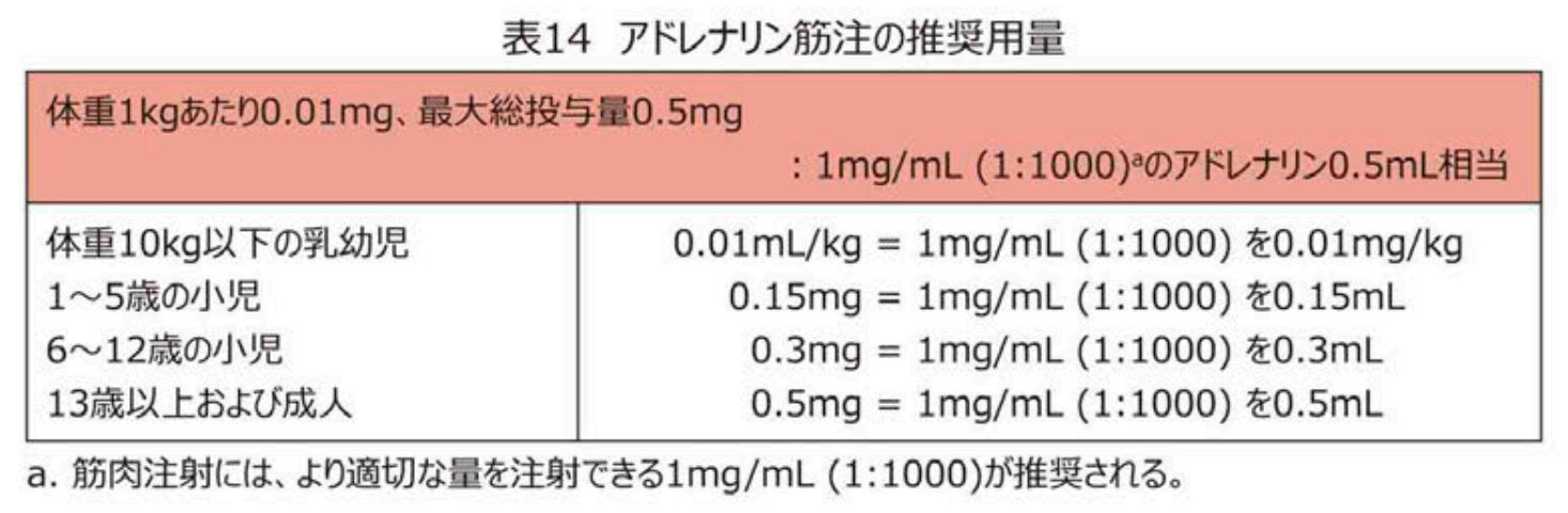 ・大腿部中央の前外側にアドレナリン (1mg/mL) 0.01 mg/kgを筋注する(最大量:成人0.5mg、小児0.3mg)。