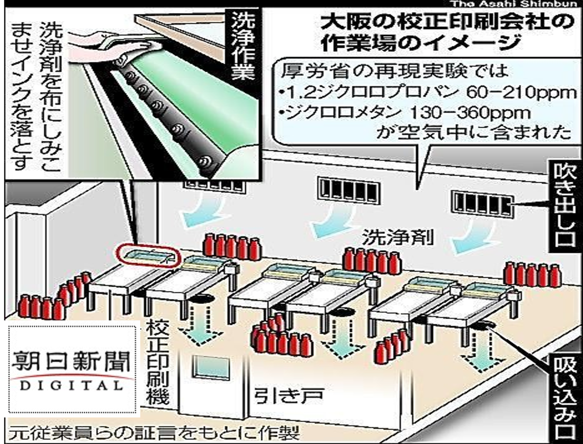 ・大阪府で、地下室の換気の十分ではない校正印刷の作業場において、きわめて頻繁にジクロロメタンと1.2-ジクロロプロパンの混合溶剤を用いて、ローラーやブランケットを洗浄する作業に従事していた作業者に胆管がんが多発した。